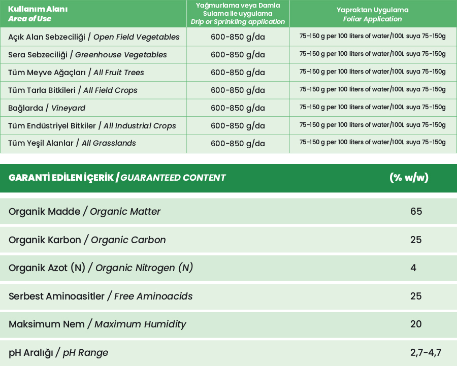 Grow Max AMINO organik madde, organik karbon, organik azot ve serbest amino asitler içeren organik bir gübredir. Bitkiler aminoasitlerin birçoğunu kendi bünyelerinde sentezlemelerine rağmen bazı aminoasitler bitkiler tarafından sentezlenemez. Grow Max AMINO bu sentezlenemeyen amino asitlerin eksikliğini giderir. Bitkinin aminoasit üretimi için harcayacağı enerji ve zamanı minimuma indirerek, tasarruf edilen bu enerjiyi büyüme ve gelişmede kullanmasını sağlar. Bitkiler tarafından direkt enerji kaynağı olarak kullanılır. Protein oluşumunu hızlandırır. Bitkinin abiyotik stres koşullarına karşı dayanıklılığını artırır. Bitkilerde verim ve kaliteyi arttırır. Dış etkenlerin sebep olduğu stres belirtilerinin çabuk atlatılmasını sağlar. Çiçeklenmenin düzgün, meyve sayısı ve kalitesinin yüksek olmasını teşvik eder. Hasat süresini kısaltır, üründe erkencilik sağlar. Toprak canlılığını sağlayarak topraktaki mikroorganizmaların çoğalmasını sağlar.
