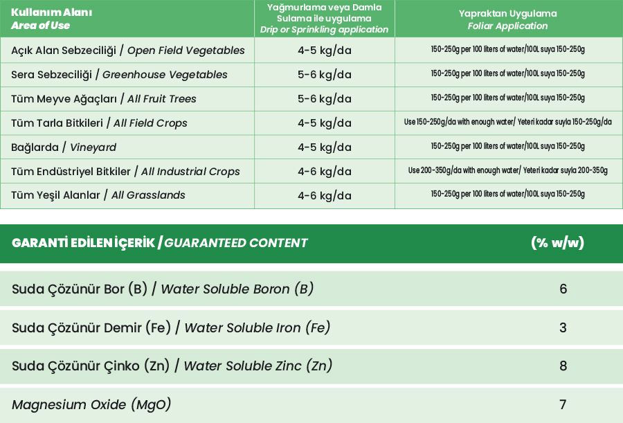 Bor (B), Demir (Fe-Sülfat) ve Çinko (Zn-Sülfat) Grow Max BZnFe bitkilerin bor, çinko ve demir ihtiyacını karşılayan ve bitkiye destek olan bir besin çözeltisidir. Her üç mikro elementin eksikliğinin görüldüğü durumlar için ideal bir gübredir. Bitki gelişimini destekleyerek bitki boyunu, dal ve gövde gelişimini artırır. Yaprak gelişimini sağlayarak yaprak ve meyve dökülmesini en aza indirir. Vejetatif aksamların yeterli ve sağlıklı oluşmasını sağlar. Bodur gelişimi önler. Bitkilerde sararmaları önler, besin noksanlıklarını giderir. Meyve kalitesini arttırır ve verim artışı sağlar. Tüm sebze ve meyvelerde kullanılır, sağlıklı bitki gelişimi ve döllenmede artış sağlar. Bor (B) elementinin bitkideki asıl fonksiyonu hücre duvarlarının oluşumunu ve dokuların yeniden çoğalmasını yani hücre bölünmesini ve büyümesini sağlar. Bitkide kök gelişimini, tomurcuk oluşumunu, çiçek oluşumunu artırır. Sağlıklı bir polen yapısını ve döllenmeyi destekler. Bor, meyve ağaçlarında ve sebzelerde meyve sayısının ve meyve tutumunun artmasında önemli bir role sahiptir. İçeriğindeki Çinko (Zn), bitkide azot metabolizmasını, nişasta oluşumunu ve tohum olgunlaşmasını etkiler. Ayrıca büyüme hormonlarının (oksin hormonu) üretimi için gerekli olan bir bitki besin elementi olan çinko; özellikle internodun uzamasında rol alır. İçeriğinde Demir (Fe), oksijen taşınım işlevini düzenler, sağlıklı kök ve meyve oluşumunu teşvik eder. Demir eksikliğinde klorofil sentezi azalır. Yapraktan (pülverizatör vb.) ve topraktan (sulama sistemleri ile) uygulanabilir.