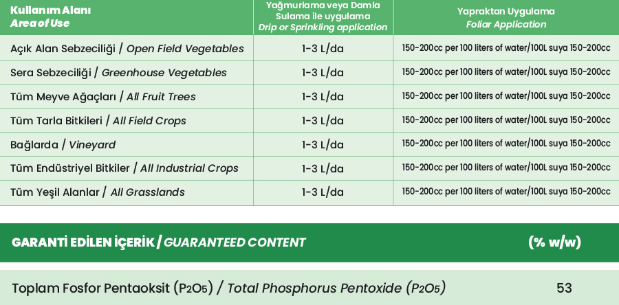 Grow Max Fosforik Asit, oldukça asidik bir gübredir. Serada, açık tarlalarda ve topraksız kültürlerde rahatlıkla uygulanabilir. Su ve toprak pH’ını düşürür. Birçok besin maddesinin alımına yardımcı olur ve kalkerli / alkali topraklarda bağlı olan mikro elementlerin (Fe, Zn, Mn, Cu) bitki tarafından alınabilirliğini teşvik eder. Sağlıklı ve güçlü çiçek gelişimi sağlar. Kalitesiz su , filtreler, düşük akış hızı ve basınç gibi nedenler damla sulama sistemlerinde tıkanmalara neden olur ve suyun homojen bir şekilde araziye dağılmasını engeller. Ve suyun yeterli ulaşmadığı bölgelerde kalite ve verim düşüklüğü görülür. Grow Max Fosforik asit, asidik yapısından dolayı bikarbonatları çözer ve nötralize eder. Bu nedenle hassas sulama sistemlerinde damlatıcılarda ve nozullarda tıkanma ve hasarı önler. Böylelikle sulama suyunun ve gübrelerin eşit dağılımını sağlar. Sulama sistemlerinin ömrünü uzatır.