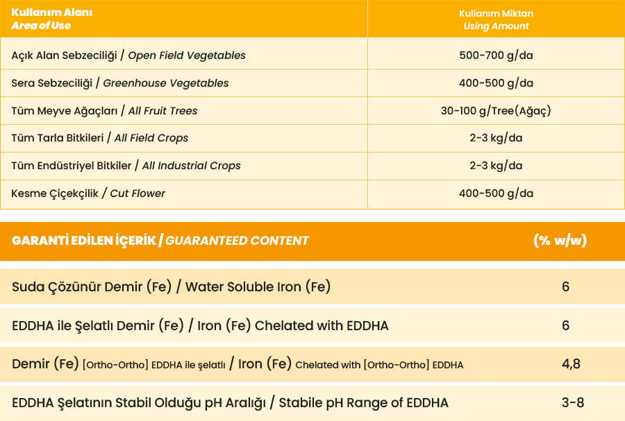 PEP FER tamamı EDDHA şelatlı demir içeren kalitesi ile özel bir üründür. Özel teknikler ile üstün kalitede hammaddelerin işlenip üretilen PEP FER %4,8 Ortho-Ortho izomeri içerir. %4,8 EDDHA şelatı sayesinde bitkinin yaprak aktif demir içeriğini artırır. Suda tamamen çözünür mikro granüler yapıdadır. Demir noksanlığı görülen topraklarda veya toprakta fazla kireç bulunması ve toprak pH’ının yüksek olduğu (kireçli ve alkali toprak) durumlarda bitkilerde demir noksanlığına bağlı büyüme ve gelişme geriliği görülür. Bu durumda tamamı %4,8 Ortho-Ortho EDDHA ile şelatlanmış PEP FER ürünü bitki tarafından kolayca alınabilir formdadır. Yüksek pH’lı topraklarda üstün aktivite gücü ile kısa sürede etki gösterir. Demir noksanlığına bağlı hastalıkları kısa sürede tedavi eder. Noksanlık sonucu görülen arazları düzeltir ve sararmaları giderir. Bitkinin besin kaynağı olan ve fotosentezden sorumlu olan klorofil pigmentinin sentezi için mutlak demir gereklidir. Dolayısıyla fotosentez için gereklidir. Yaprağın yeşil rengini koyulaştırır ve güneş enerjisinden maksimum fayda almasını sağlar. Solunuma ve protein oluşumuna yardımcı olur. Verimi artırmaya yardımcı olur. Birçok enzim faaliyetlerinin oluşmasını sağlar. Her türlü meyve ağacı, bağ, narenciye, sebze ve süs bitkilerinde görülen demir klorozunu önler. Geniş pH aralığına sahiptir.